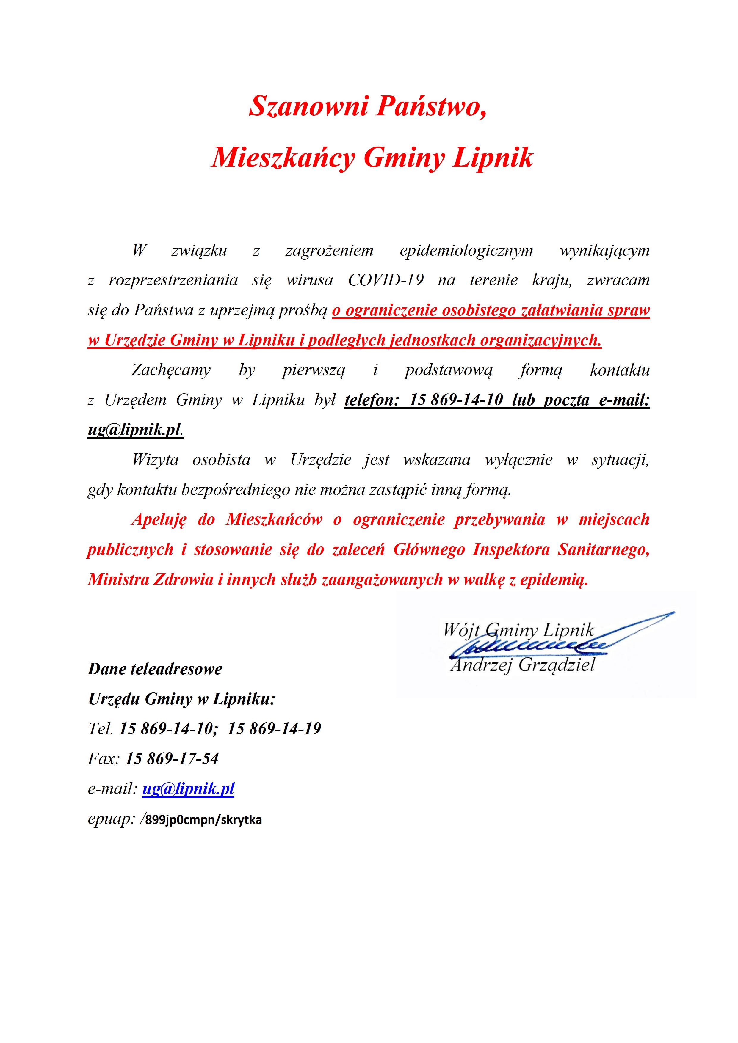 Apel Wójta Gminy Lipnik w związku z koronawirusem COVID-19
