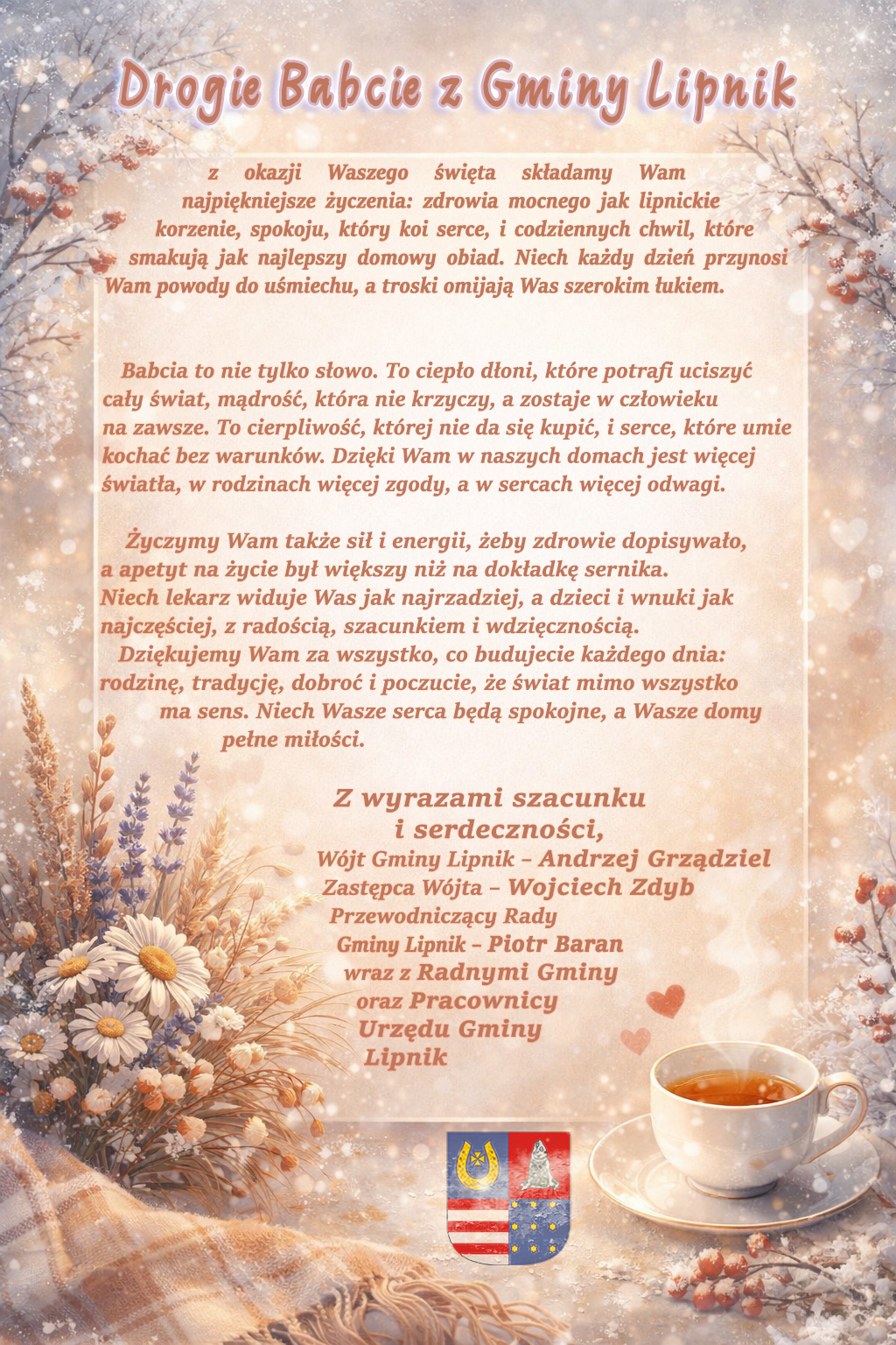 Babcia to nie tylko słowo. To ciepło dłoni, które potrafi uciszyć cały świat, mądrość, która nie krzyczy, a zostaje w człowieku na zawsze. To cierpliwość, której nie da się kupić, i serce, które umie kochać bez warunków. Dzięki Wam w naszych domach jest więcej światła, w rodzinach więcej zgody, a w sercach więcej odwagi.