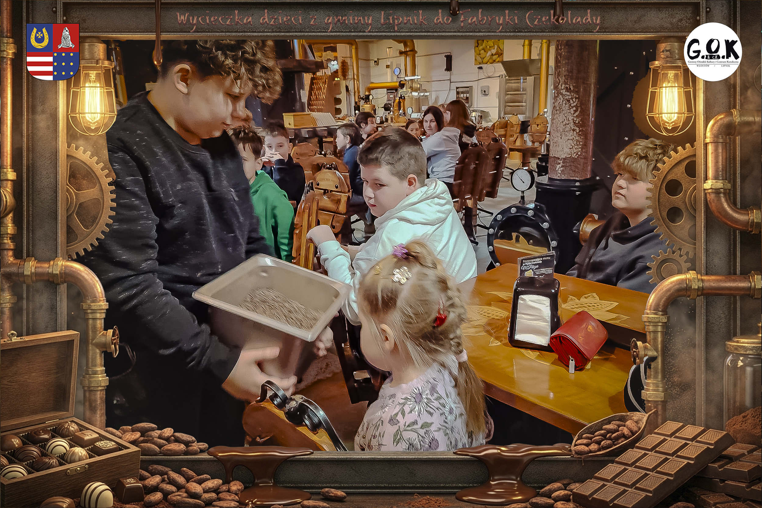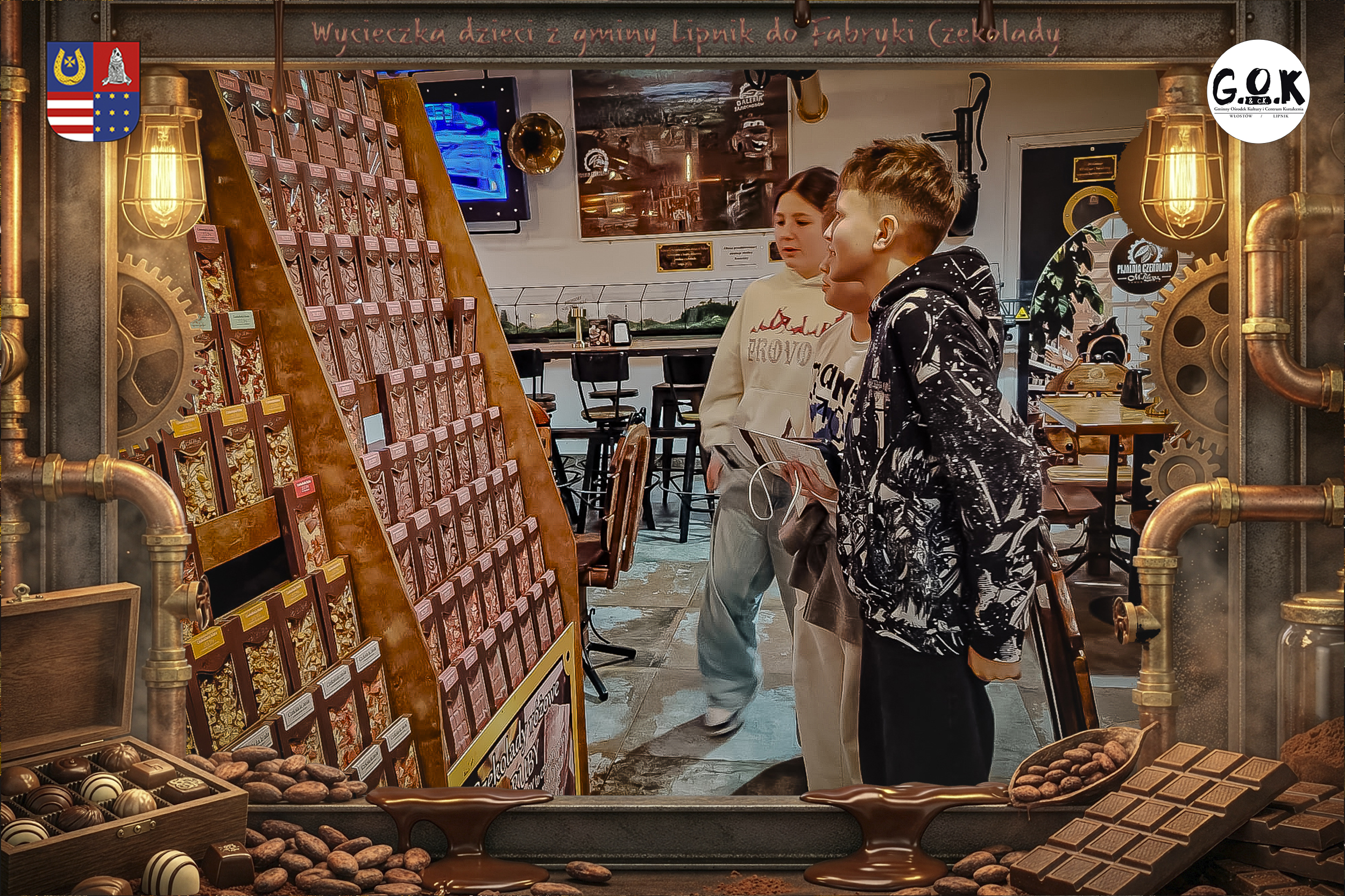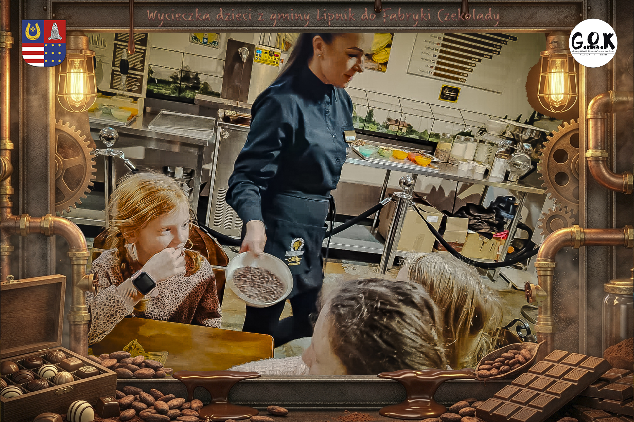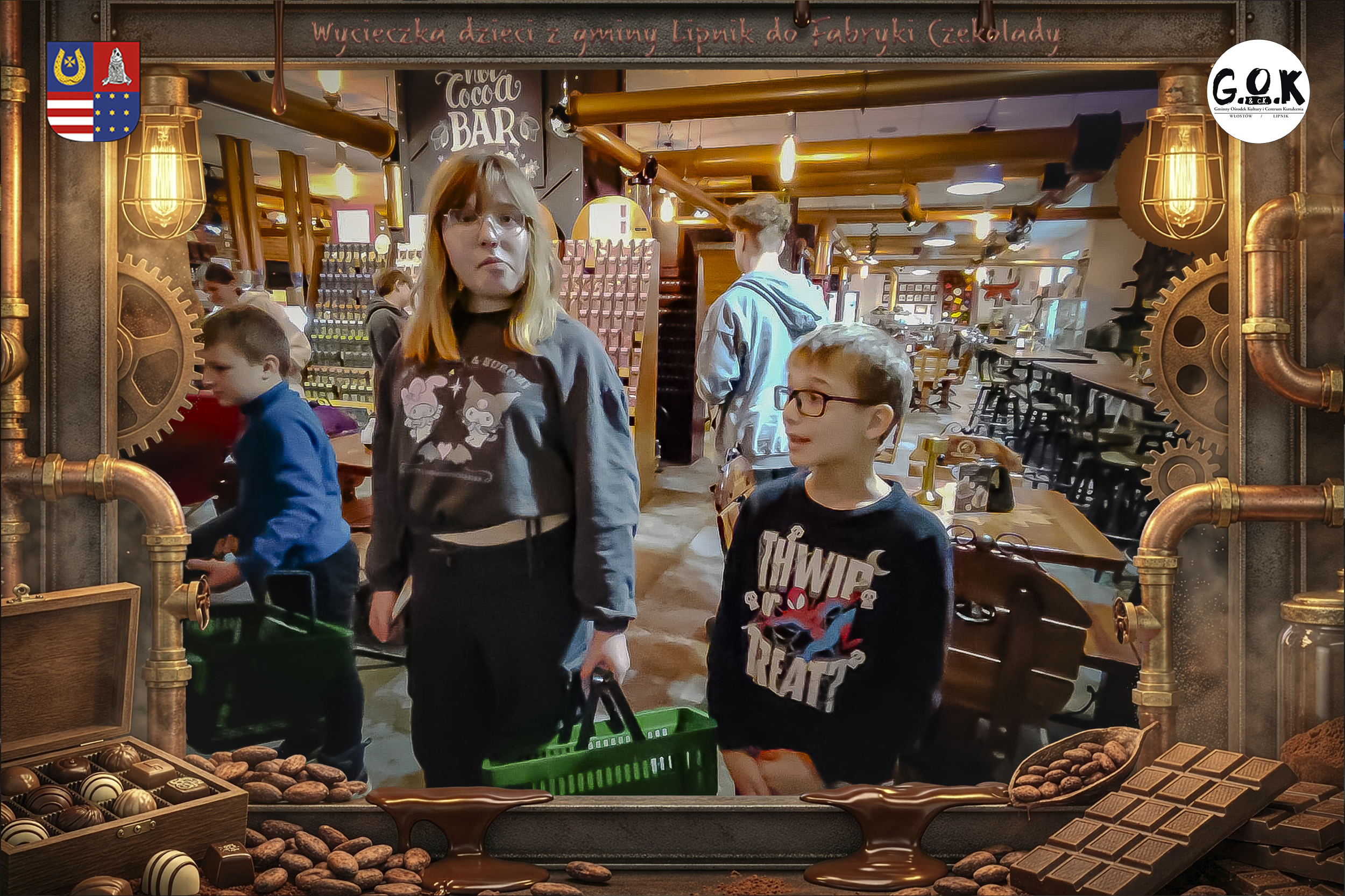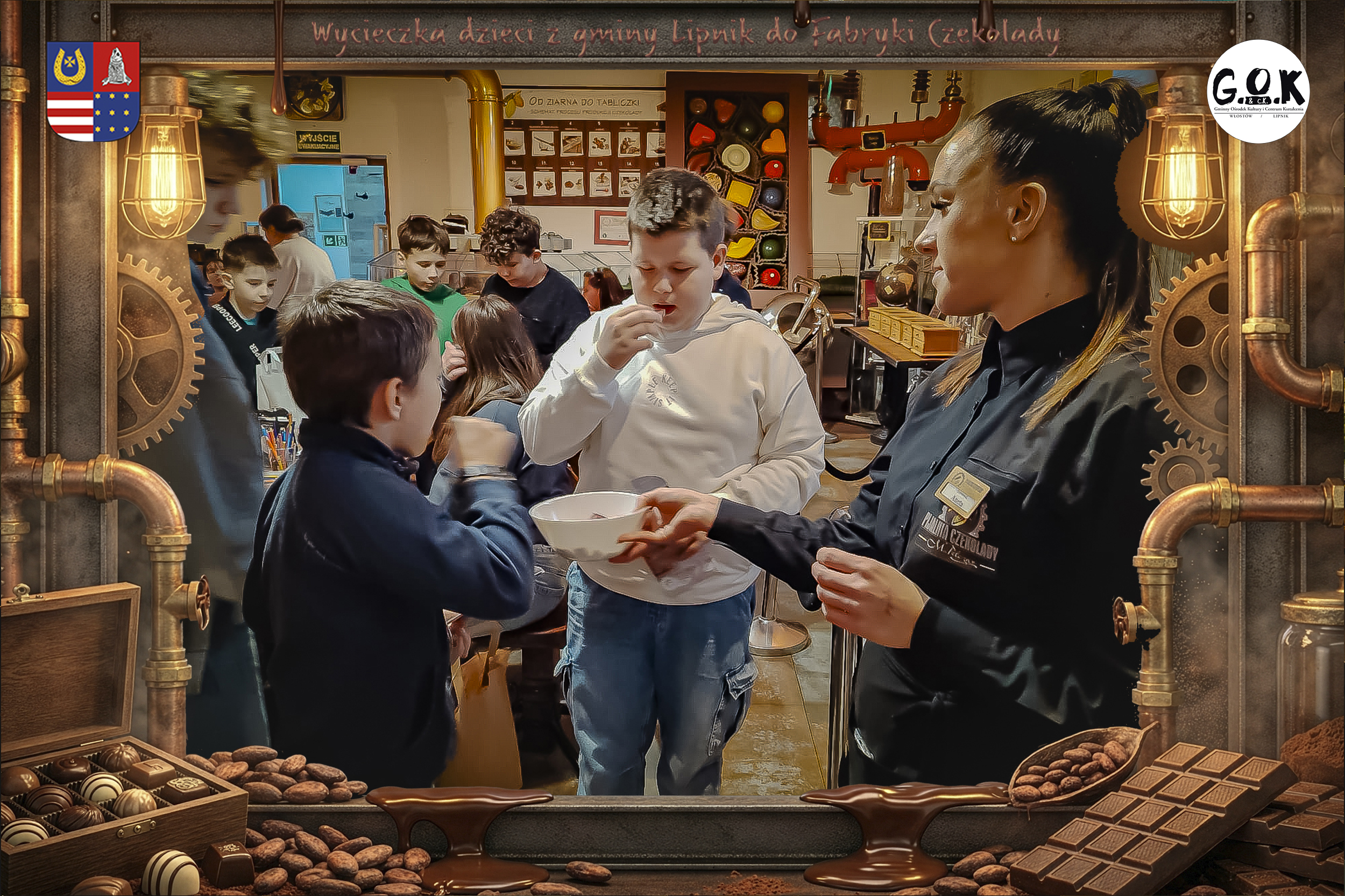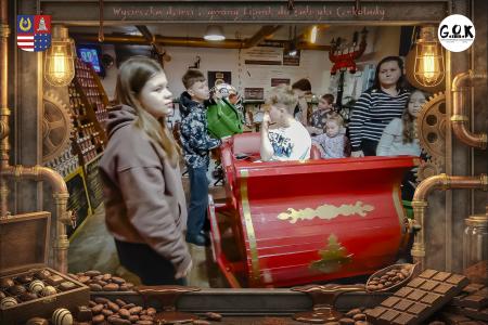 Dzieciaki wskoczyły do czekoladowego świata, gdzie miedziane rury, koła zębate i cały ten „fabryczny teatr” robią klimat jak z filmu, tylko zamiast dymu z komina unosi się zapach kakao. Na zdjęciach widać to najlepiej: raz cisza przed burzą (pusta sala, gotowa na małych odkrywców), a chwilę później już pełen ruch, śmiech, ciekawskie spojrzenia i te miny typu: „Dobra, tu się dzieje magia”