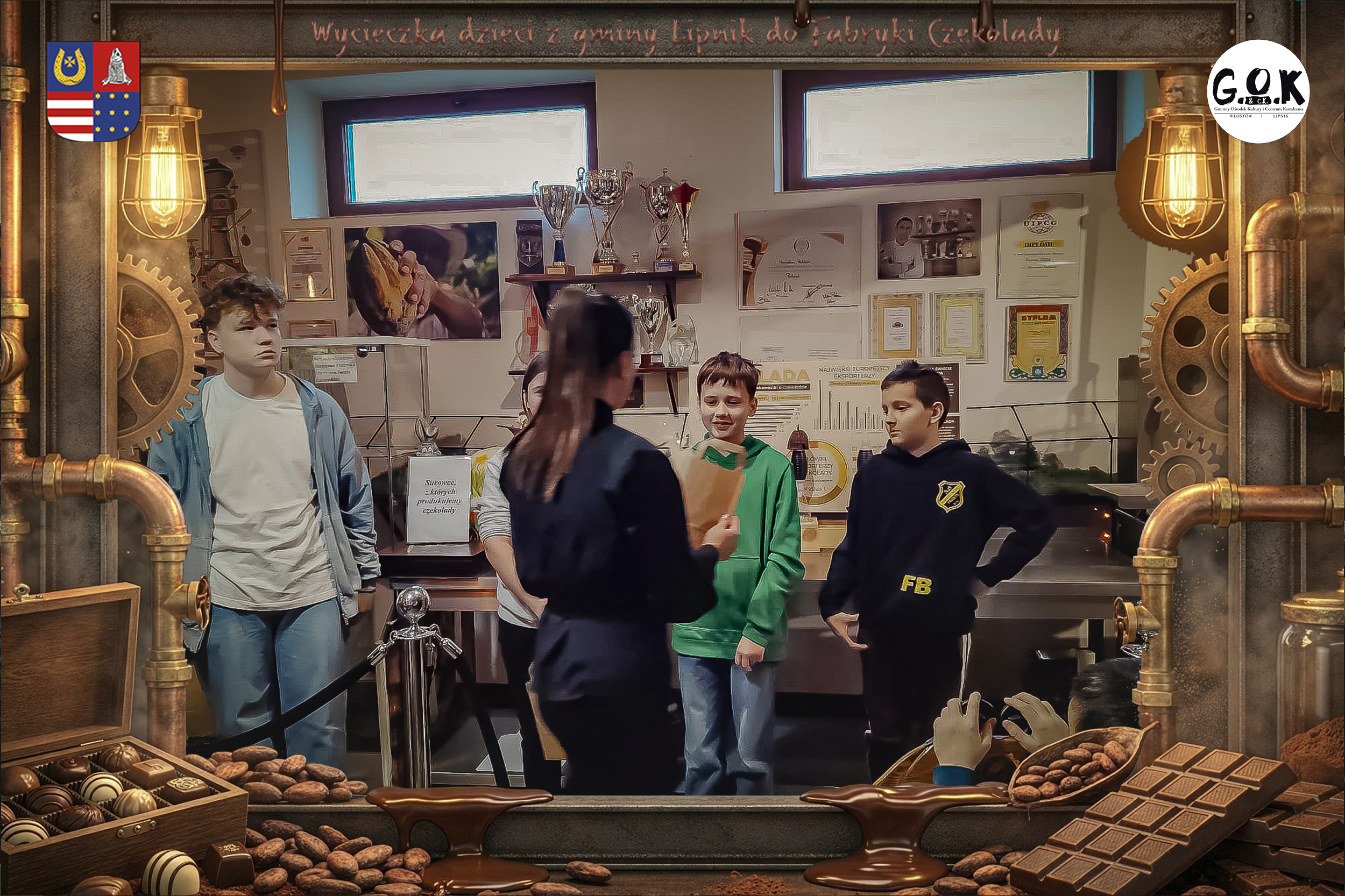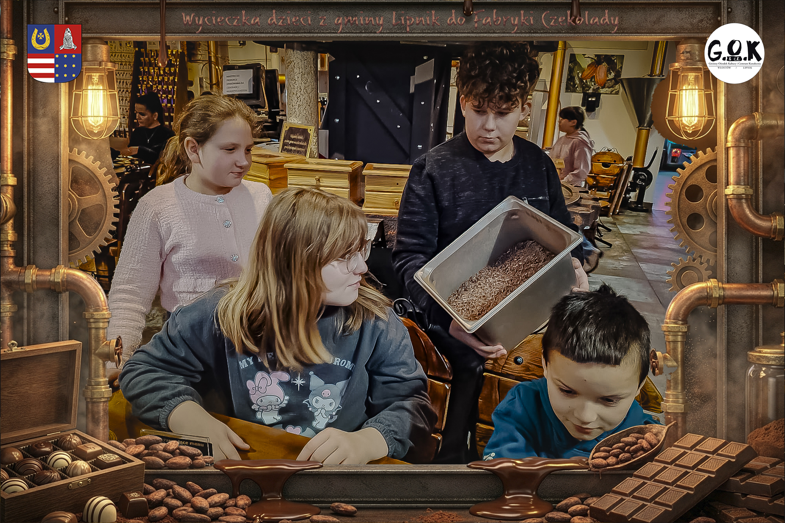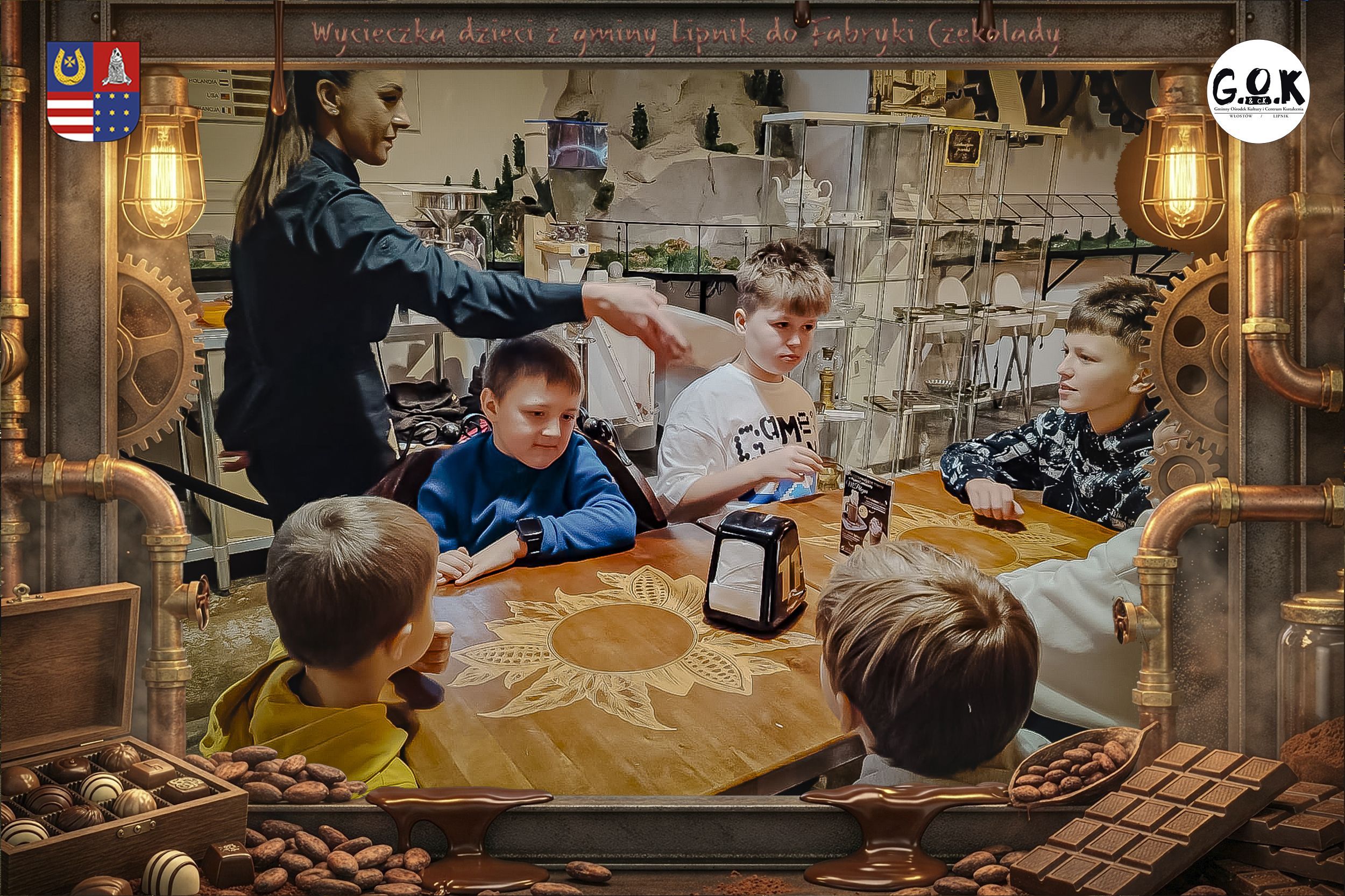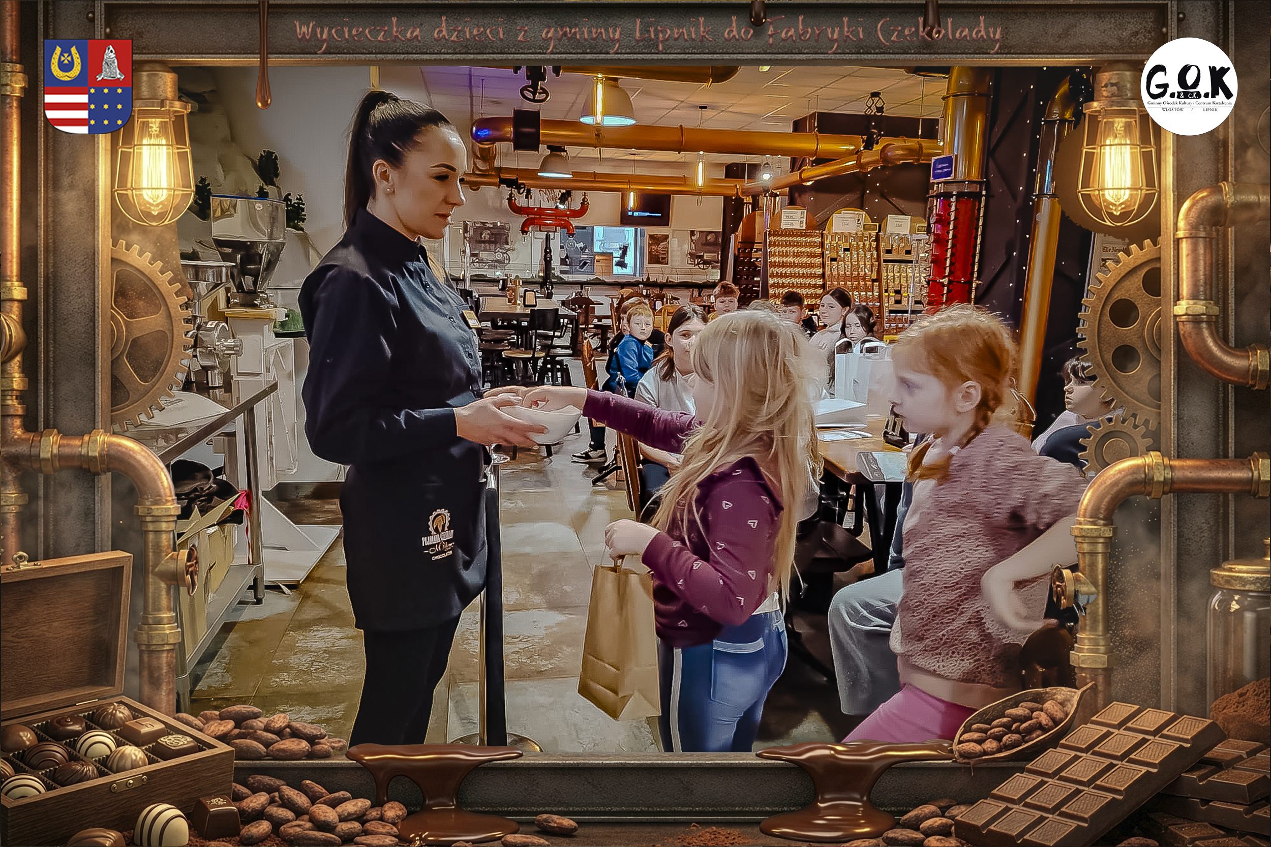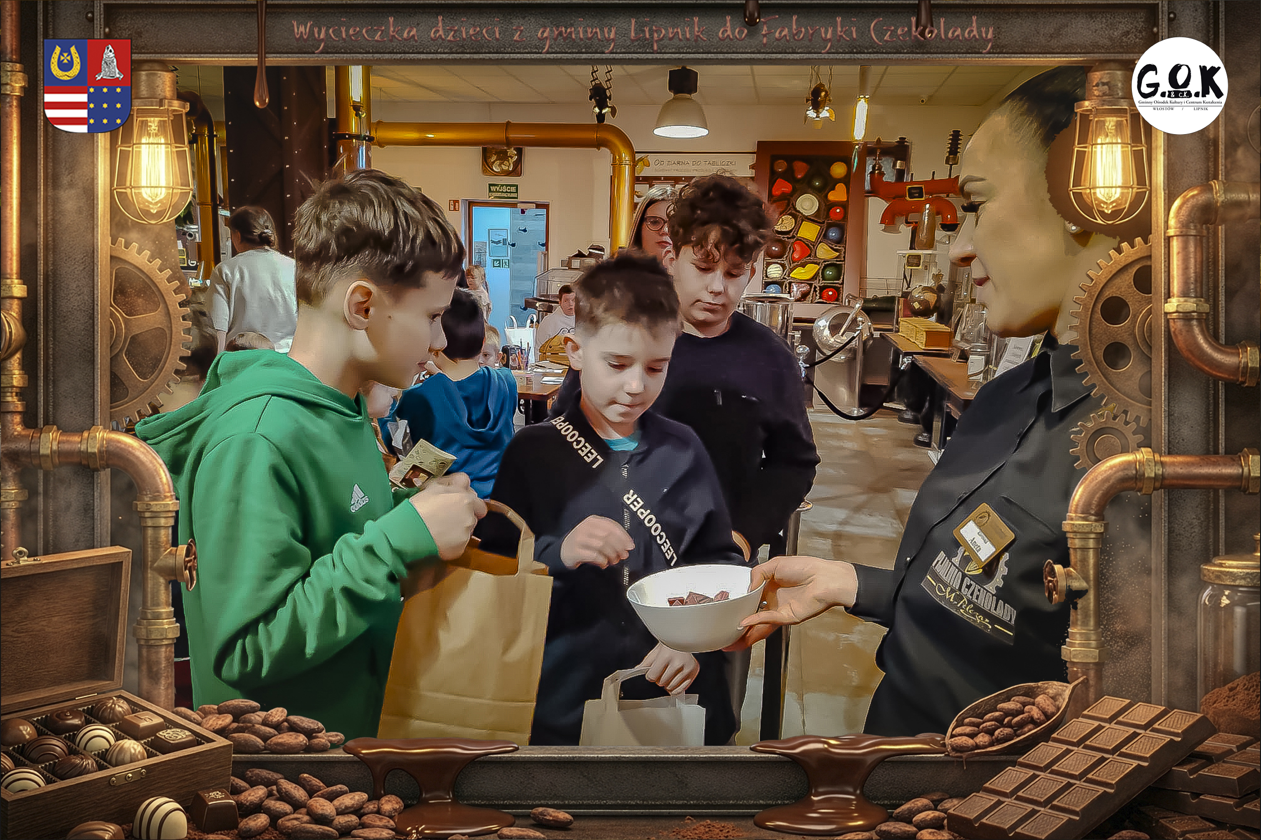 Dzieciaki wskoczyły do czekoladowego świata, gdzie miedziane rury, koła zębate i cały ten „fabryczny teatr” robią klimat jak z filmu, tylko zamiast dymu z komina unosi się zapach kakao. Na zdjęciach widać to najlepiej: raz cisza przed burzą (pusta sala, gotowa na małych odkrywców), a chwilę później już pełen ruch, śmiech, ciekawskie spojrzenia i te miny typu: „Dobra, tu się dzieje magia”
