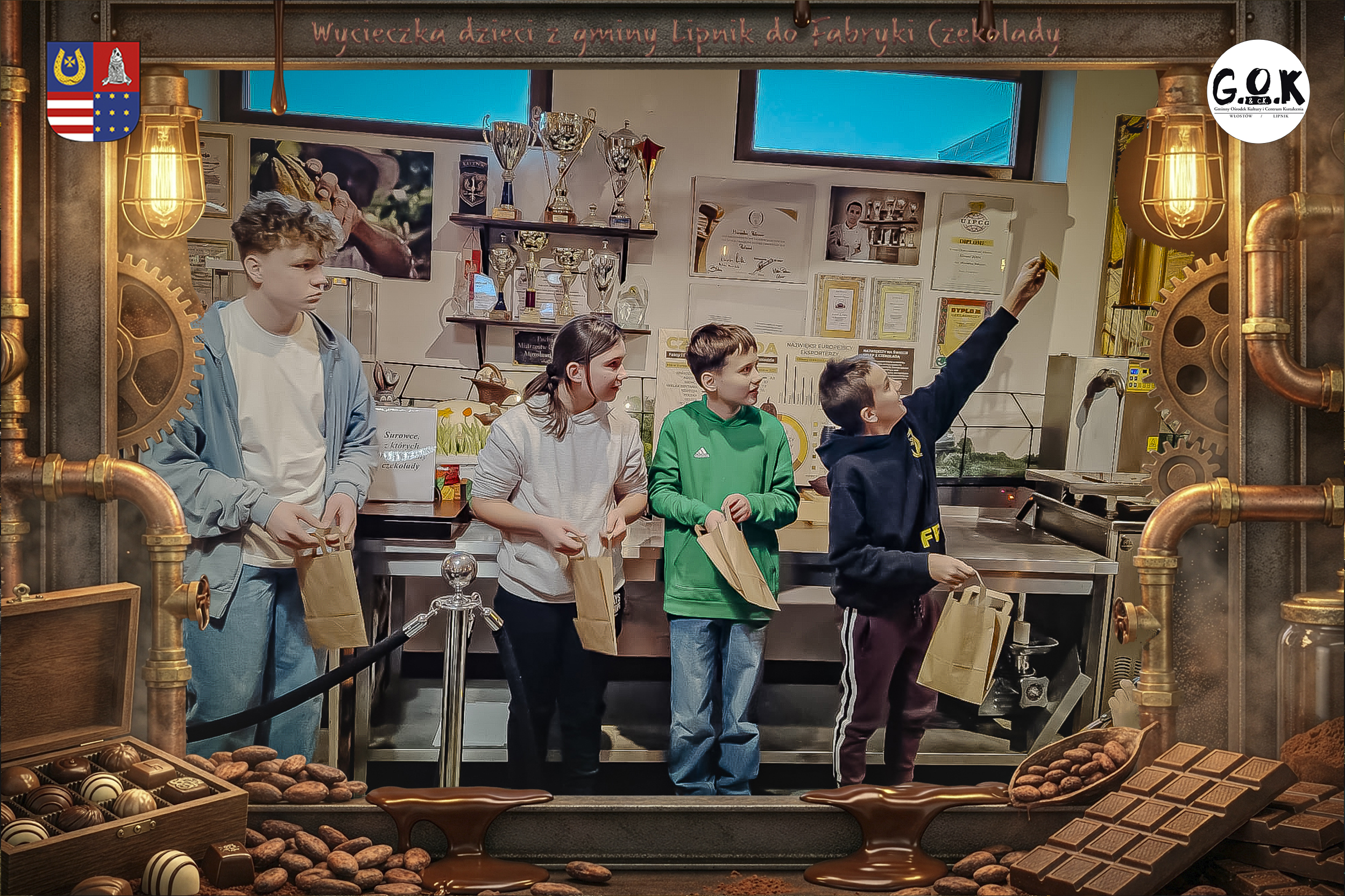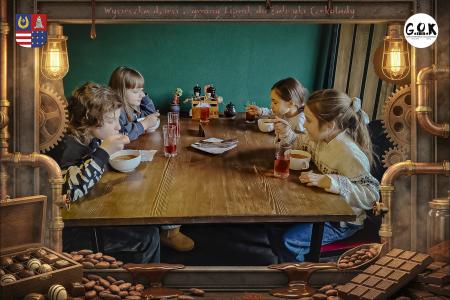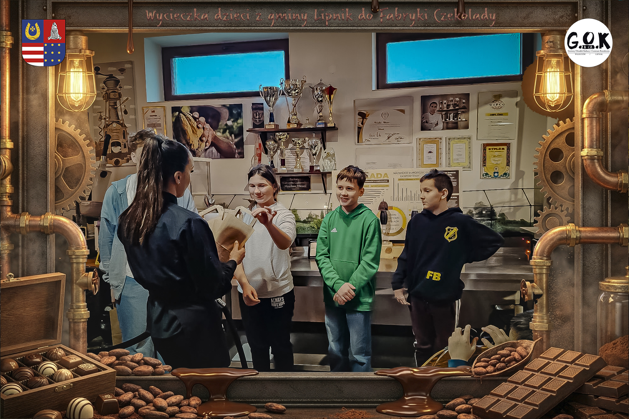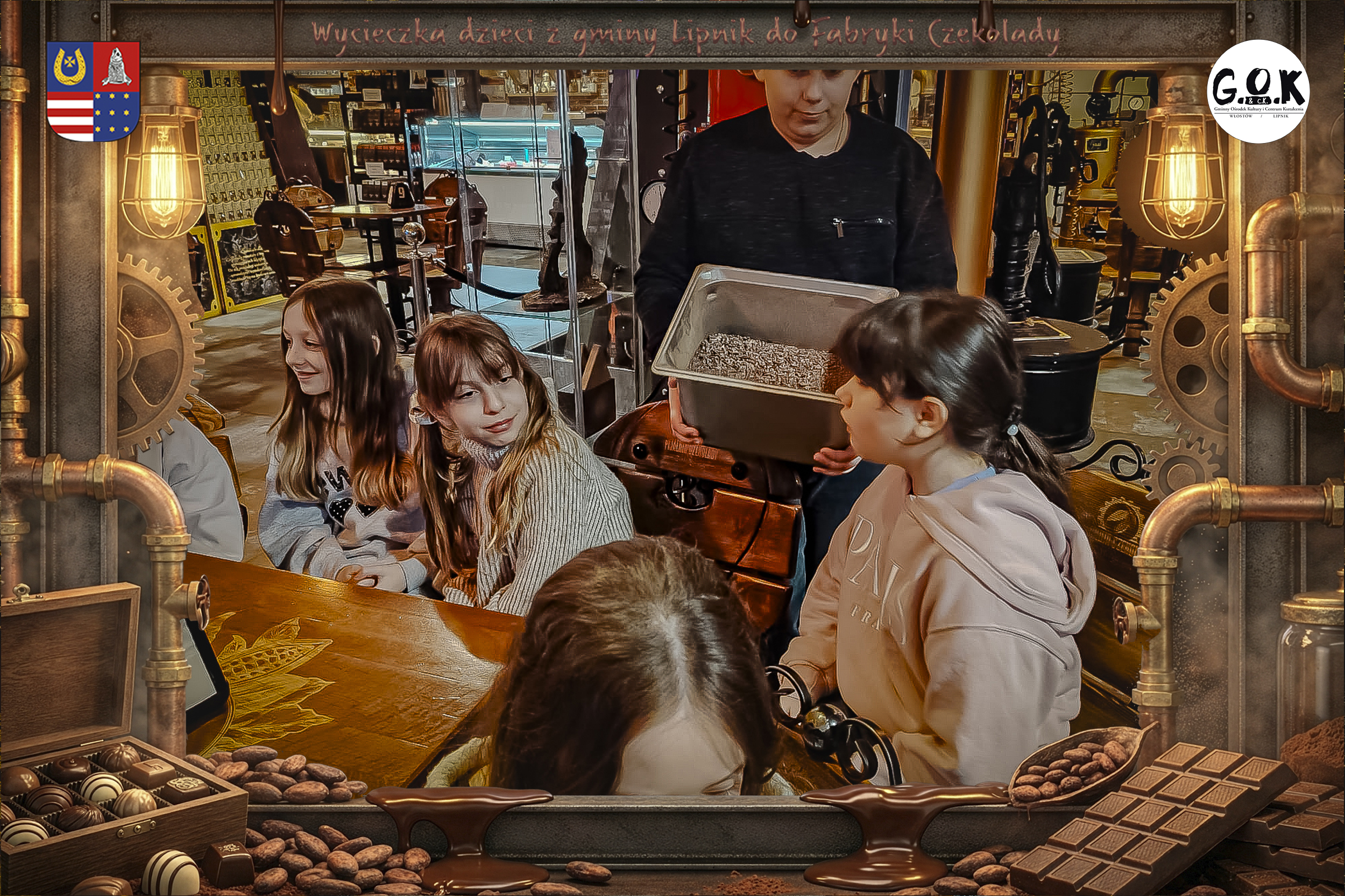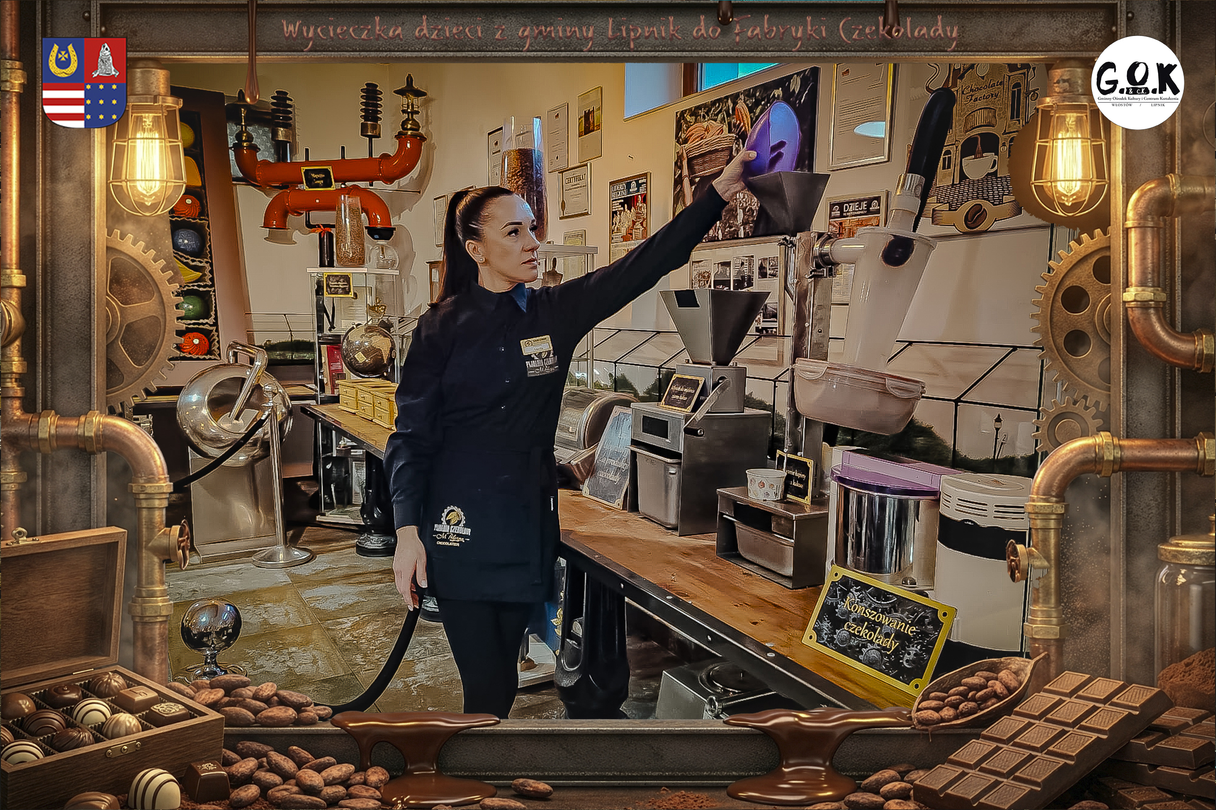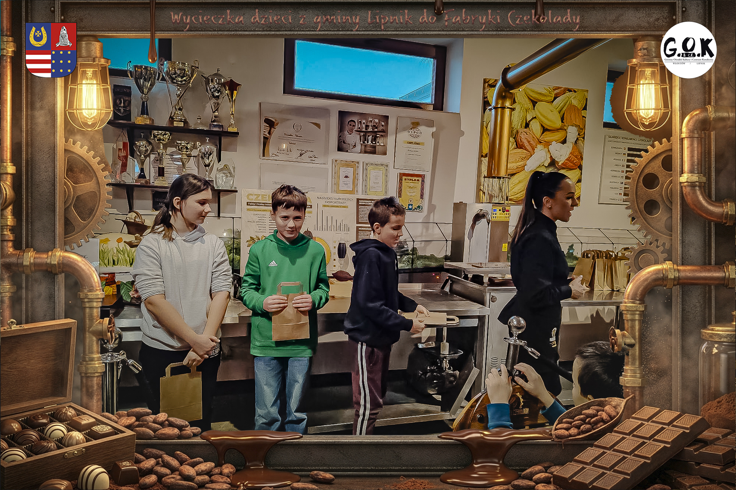 Dzieciaki wskoczyły do czekoladowego świata, gdzie miedziane rury, koła zębate i cały ten „fabryczny teatr” robią klimat jak z filmu, tylko zamiast dymu z komina unosi się zapach kakao. Na zdjęciach widać to najlepiej: raz cisza przed burzą (pusta sala, gotowa na małych odkrywców), a chwilę później już pełen ruch, śmiech, ciekawskie spojrzenia i te miny typu: „Dobra, tu się dzieje magia”