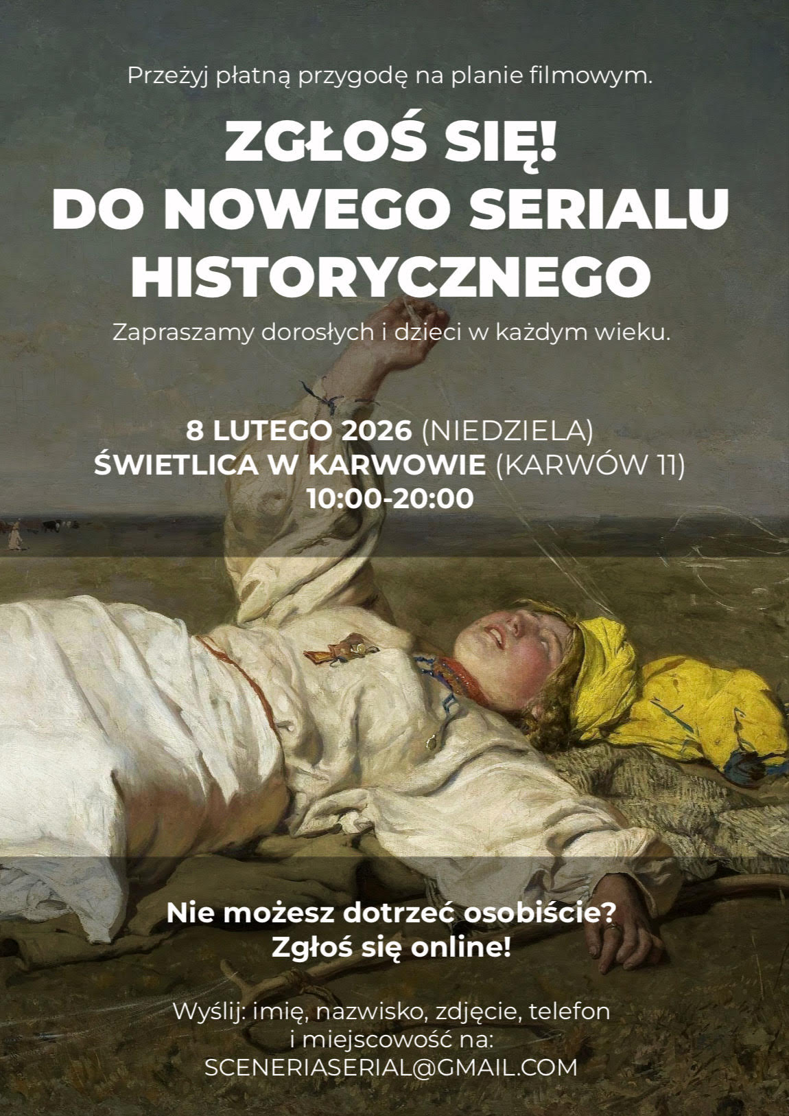 Dla tych, którzy nie mogą pojawić się osobiście, istnieje możliwość zgłoszenia się drogą mailową pod adresem: sceneriaserial@gmail.com z informacjami: imię i nazwisko, wiek, nr telefonu, miejsce zamieszkania (miasto/wieś) oraz zdjęcie twarzy.